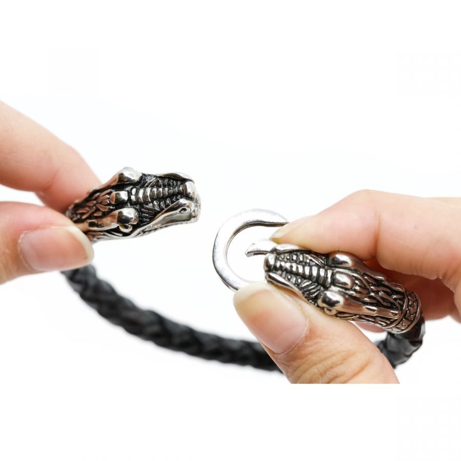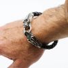 doppeltes drachenarmband aus stahl und leder. Der verschluss ist dank eines massiven runden karabinerhakens extrem sicher.