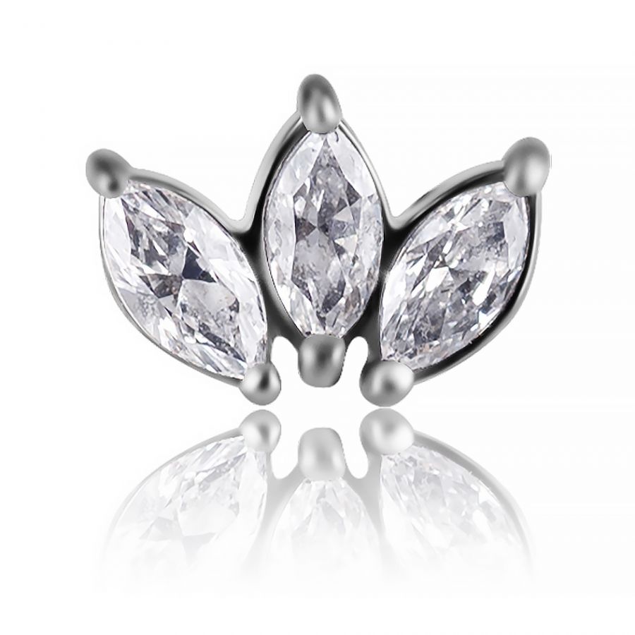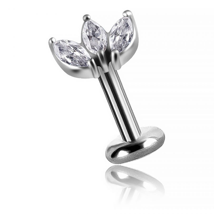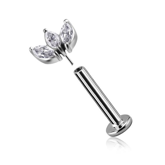 hochwertiges gewindeloses titan-labret mit lotusblüten-förmigem zubehörteil. Das ersatzteil besteht aus einer kobalt-chrom-legierung und ist mit drei edlen weißen zirkonia-kristallen verziert.