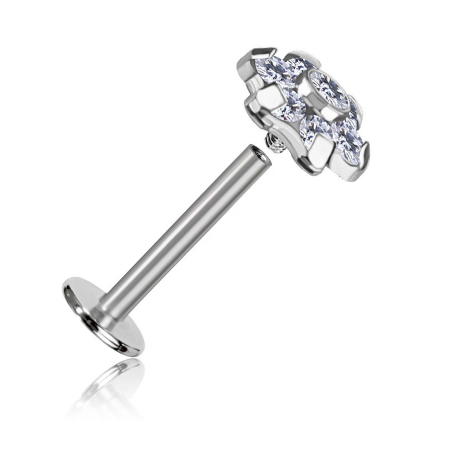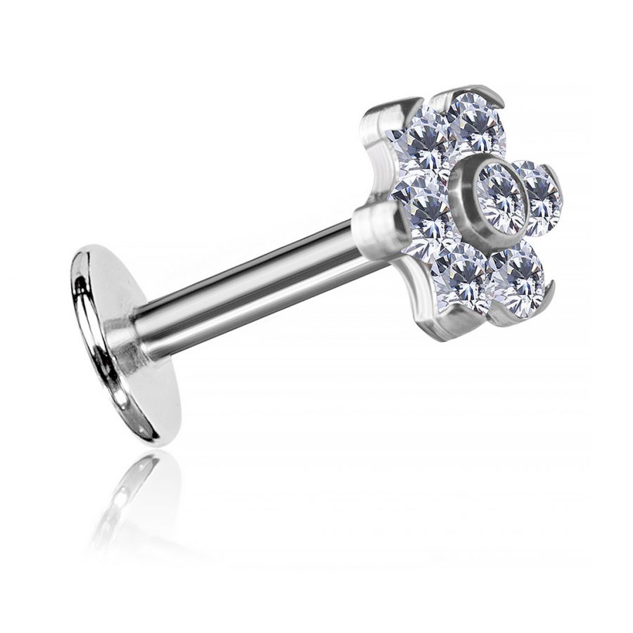 ein titan-labret mit einem blütenförmigen accessoire mit sechs kristallblütenblättern, darunter ein zentrales, aus hochwertigem zirkonia, das für einen bemerkenswerten glanz sorgt.