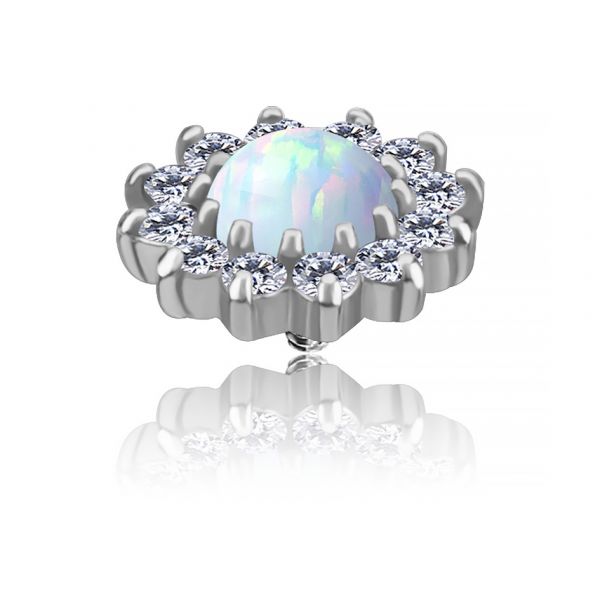 accessoire aus 100% nickelfreier kobalt-chrom-legierung. Die blume besticht durch einen wunderschönen opal in der mitte, verziert mit zwölf kleinen, funkelnden zirkonia-kristallen. Passend für labrets und 1,2 mm innengewindestäbe.