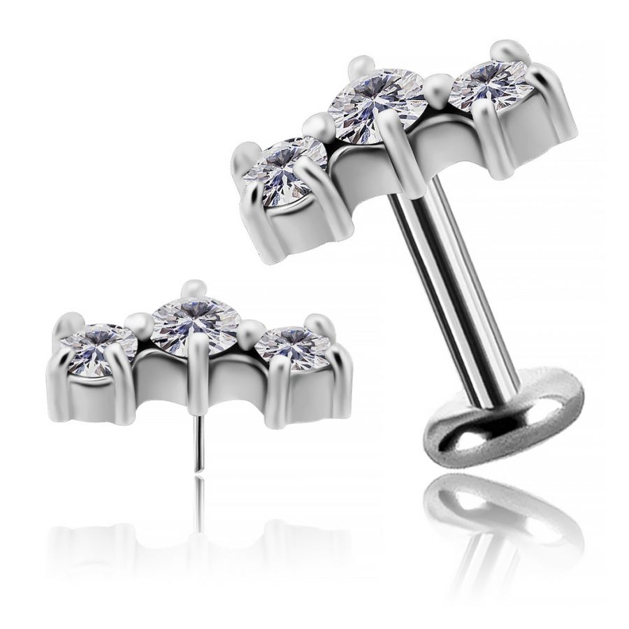 dieses elegante threadlose ohrpiercing besteht aus einem titan-labret und einem dekorativen element, das mit drei leuchtenden weißen premium-cubic-zirconia verziert ist, die durch ihre intensive brillanz überzeugen und in einem feinen bogen angeordnet sind. Gefertigt aus chrom-kobalt-legierung, 100% nickelfrei. Die hervorragenden eigenschaften dieser legierung ermöglichen die herstellung von leichtem und zugleich äußerst widerstandsfähigem schmuck mit einer präzisen verarbeitung, die herkömmlichen metallen überlegen ist.