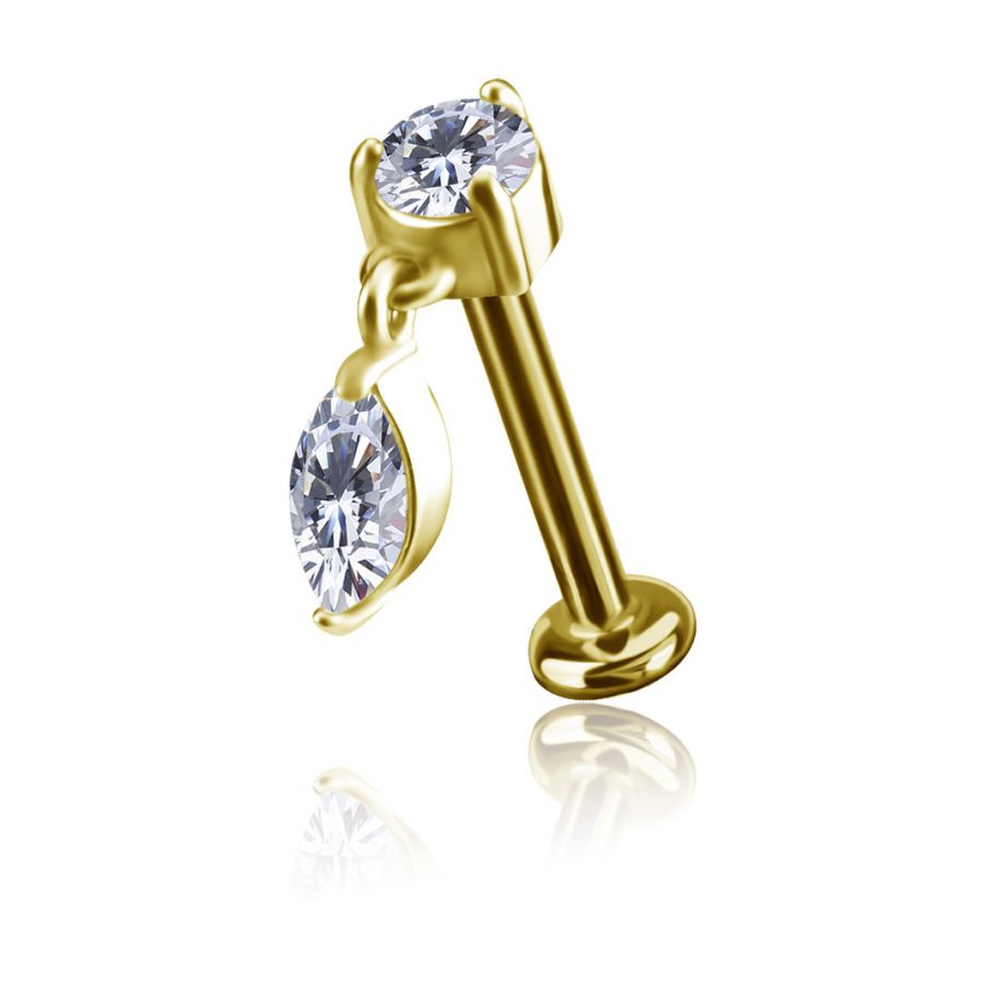 dieses 18k vergoldete gewindelose labret aus titan mit einem 18k vergoldeten ersatzteil aus chrom-kobalt-legierung, 100% nickelfrei, zeichnet sich durch zwei besonders strahlende weiße premium-cubic-zirconia-steine aus, von denen einer tropfenförmig ist und mit einer dezenten bewegung frei schwingt. Dank der fortschrittlichen eigenschaften dieser legierung vereinen unsere schmuckstücke leichtigkeit, robustheit und eine makellose oberfläche, die herkömmlichen metallen überlegen ist. Ein material, das auch für die empfindlichste haut perfekt geeignet ist.