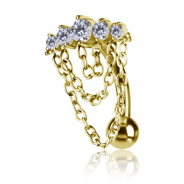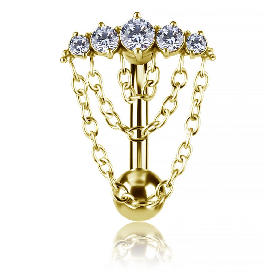 piercing para ombligo invertido con barra curva, adornado con cinco circonitas premium y decorado con tres cadenas de diferentes longitudes. Fabricado en acero quirúrgico de alta calidad con chapado en oro de 24k, el diseño oculta la barra, creando un refinado efecto de cristales suspendidos.