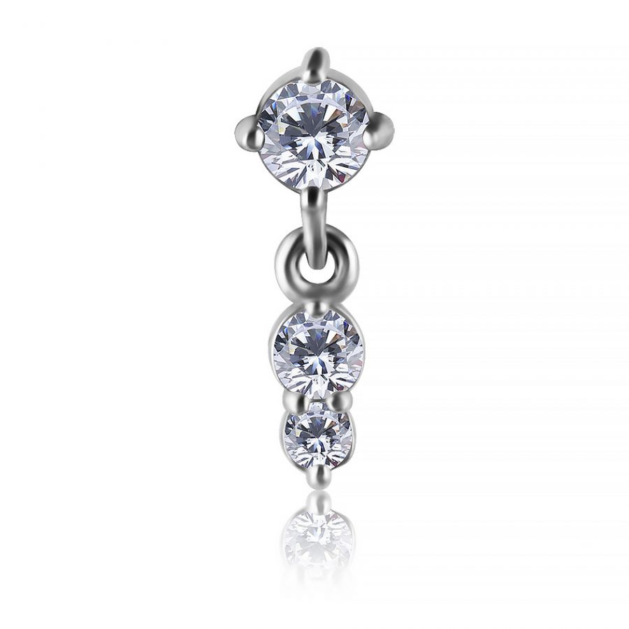 labret threadless en titanio con un accesorio en aleación de cromo-cobalto adornado con tres brillantes premium cubic zirconia blancos, dos de los cuales permanecen delicadamente suspendidos con un movimiento sutil, creando un refinado juego de luces con cada movimiento y aportando a la joya una elegancia contemporánea y sofisticada. Gracias a las propiedades avanzadas de esta aleación, nuestras joyas combinan ligereza, resistencia y un acabado impecable superior al de los metales tradicionales. Material perfecto incluso para las pieles más delicadas. 100% libre de níquel.