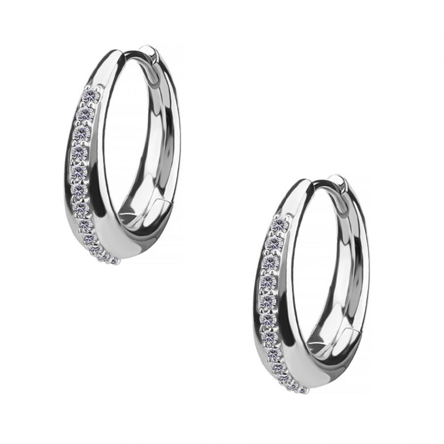 elaborados en una aleación de cromo-cobalto, estos pendientes combinan resistencia y ligereza. La estructura metálica, sólida pero refinada, enmarca una fila de cristales blancos de circonita cúbica premium, ordenados cuidadosamente por su brillo.