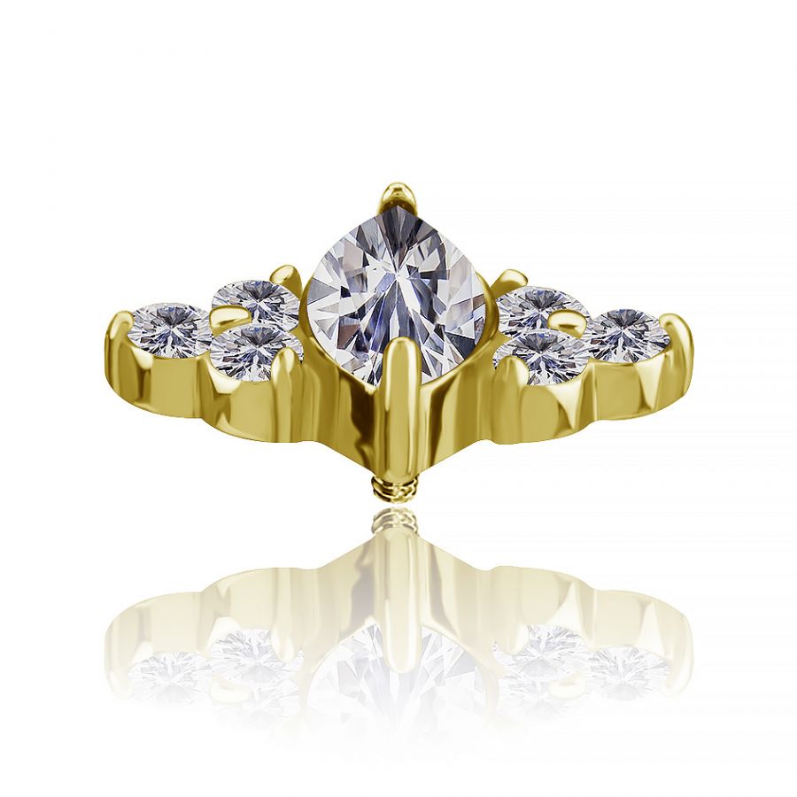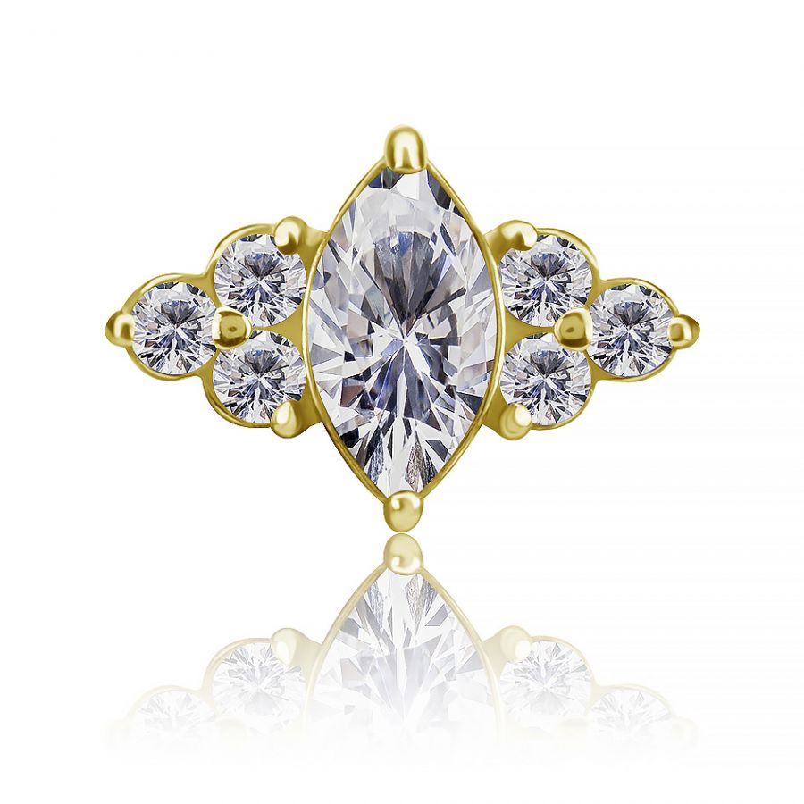 una combinación de impresionantes circonitas blancas premium y cristales de cromo-cobalto que realzan e iluminan tu personalidad. Un repuesto de cromo-cobalto bañado en oro de 18k, apto para piercings con rosca interna. 100 % libre de níquel.