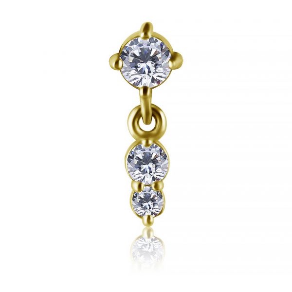 repuesto threadless en aleación de cromo-cobalto bañada en oro de 18k, adornado con tres brillantes premium cubic zirconia blancos, dos de los cuales permanecen delicadamente suspendidos con un movimiento sutil, creando un refinado juego de luces con cada movimiento y aportando a la joya una elegancia contemporánea y sofisticada. Gracias a las propiedades avanzadas de esta aleación, nuestras joyas combinan ligereza, resistencia y un acabado impecable superior al de los metales tradicionales. Material perfecto incluso para las pieles más delicadas. 100% libre de níquel.
