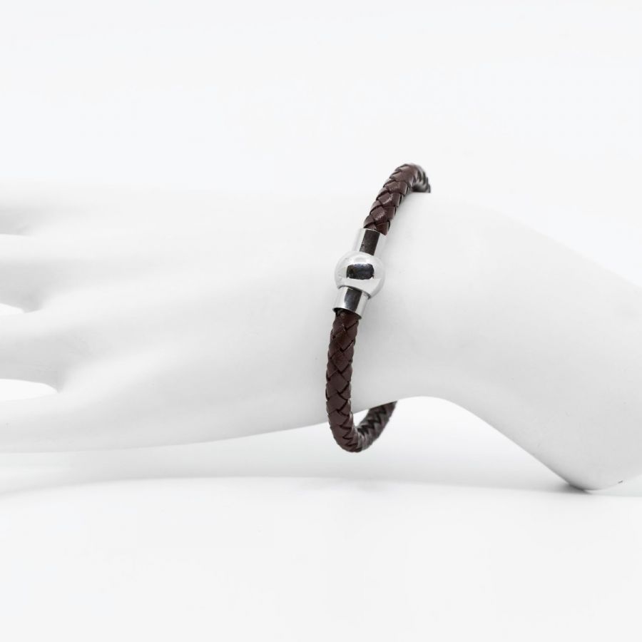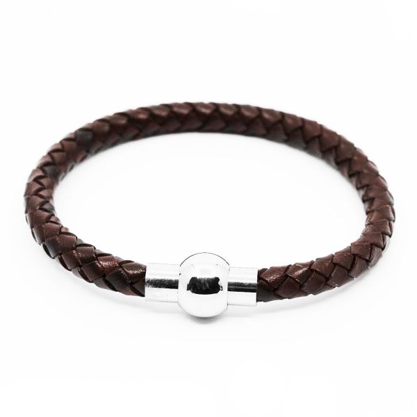 bracciale intrecciato in cuoio di color marrone scuro con una chiusura in acciaio chirurgico a forma di sfera magnetica.