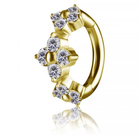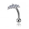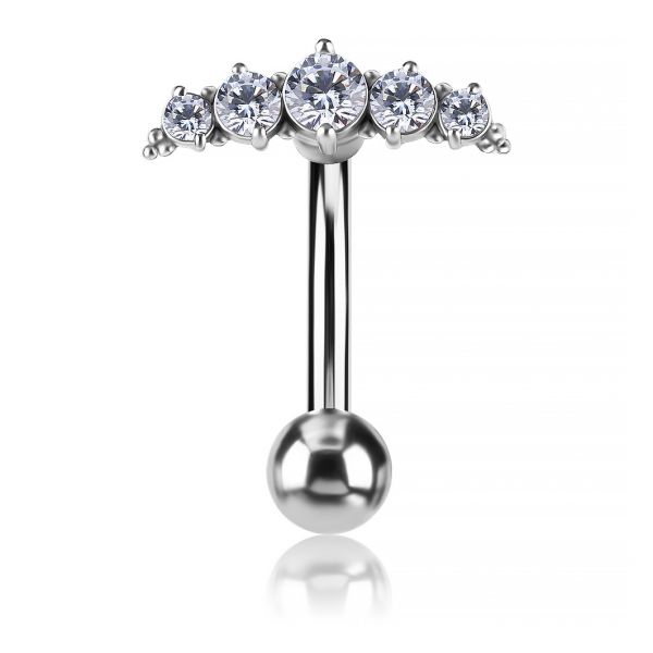 barra curva reverse per ombelico, con un elegante design arricchito da cinque cristalli premium in zirconia incastonati. Realizzata in acciaio chirurgico di alta qualità, la barra rimane nascosta, creando l'effetto di cristalli sospesi.