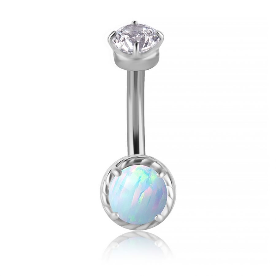 grazioso gioiello in acciaio chirurgico per il piercing al rook con filettatura interna, impreziosito da un elegante opale bianco da laboratorio e accompagnato da un ricambio con un brillante cristallo in cubic zirconia premium.